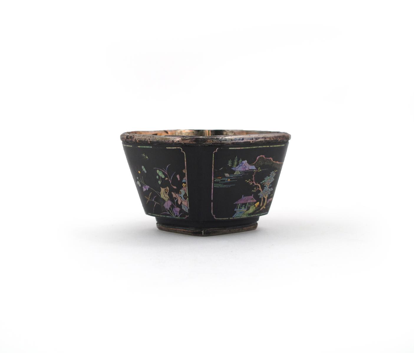A small Chinese laque burgauté square cup 18th century, each face with a panel inlaid with mother of pearl, alternately depicting blossoming prunus and watery mountainous pagoda landscapes, the interior with a metal liner, 5.7cm.