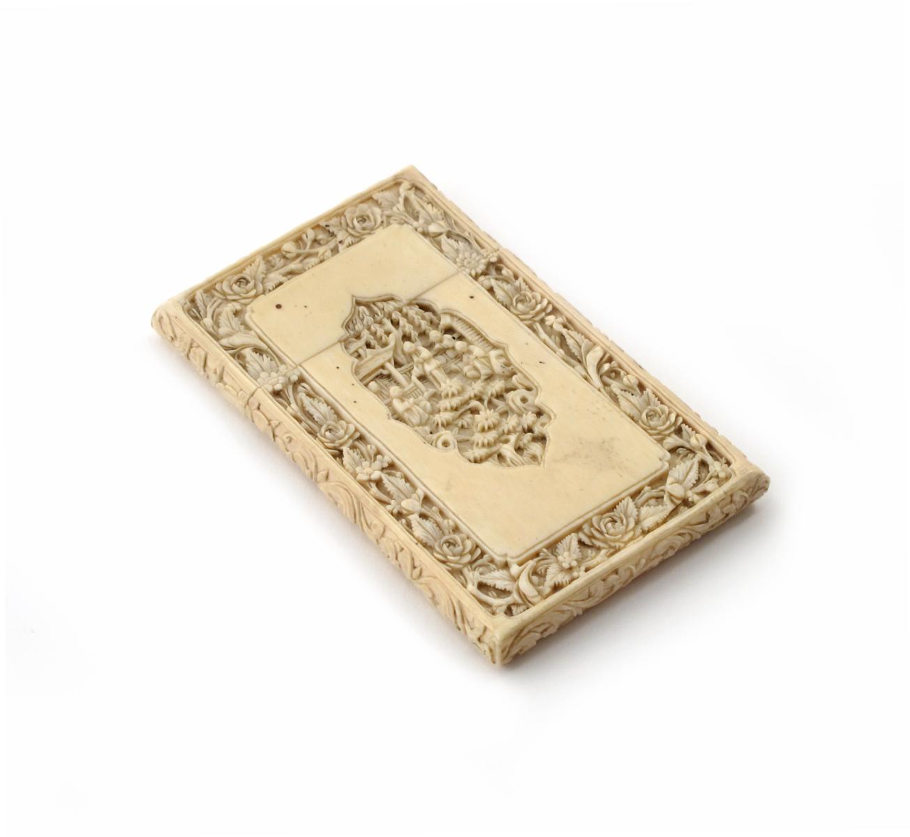 λ A Chinese Canton ivory card case 19th century, carved in relief with panels containing peony and scrolling foliage, each side with a central cartouche containing small figures amidst pine and willow before pagodas, 10.7cm. (2)