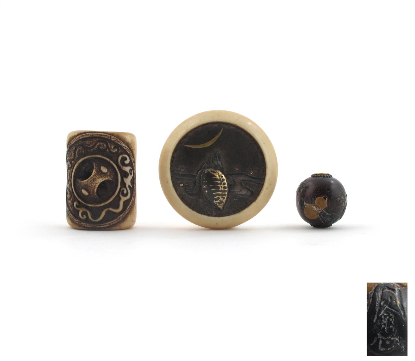 λ A Japanese stag antler hako netsuke 19th century, Kokusai school, carved with a circular mirror to one side in Asakusa style, an ivory kagamibuta decorated with a minogame and an ojime decorated with rice bails and gourds, 4cm. (4)