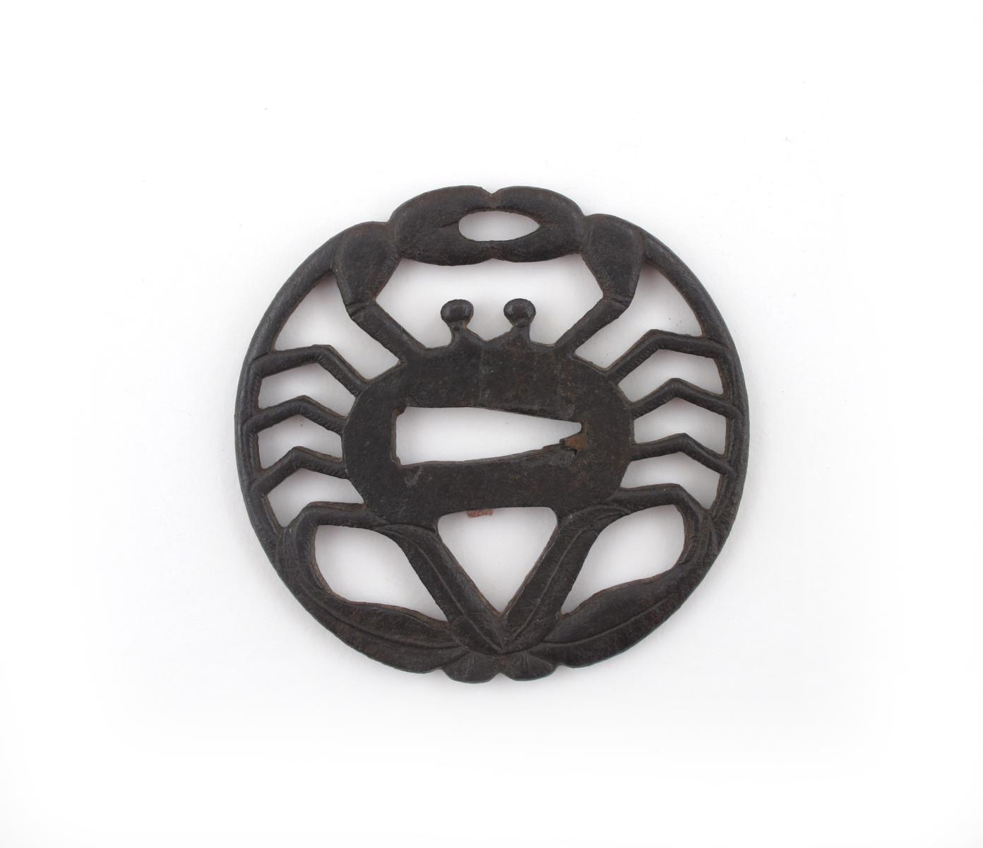 A Japanese iron sukashi tsuba 17th century, formed as a crab on four slender leaves, with fitted box, 7.6cm. (2)