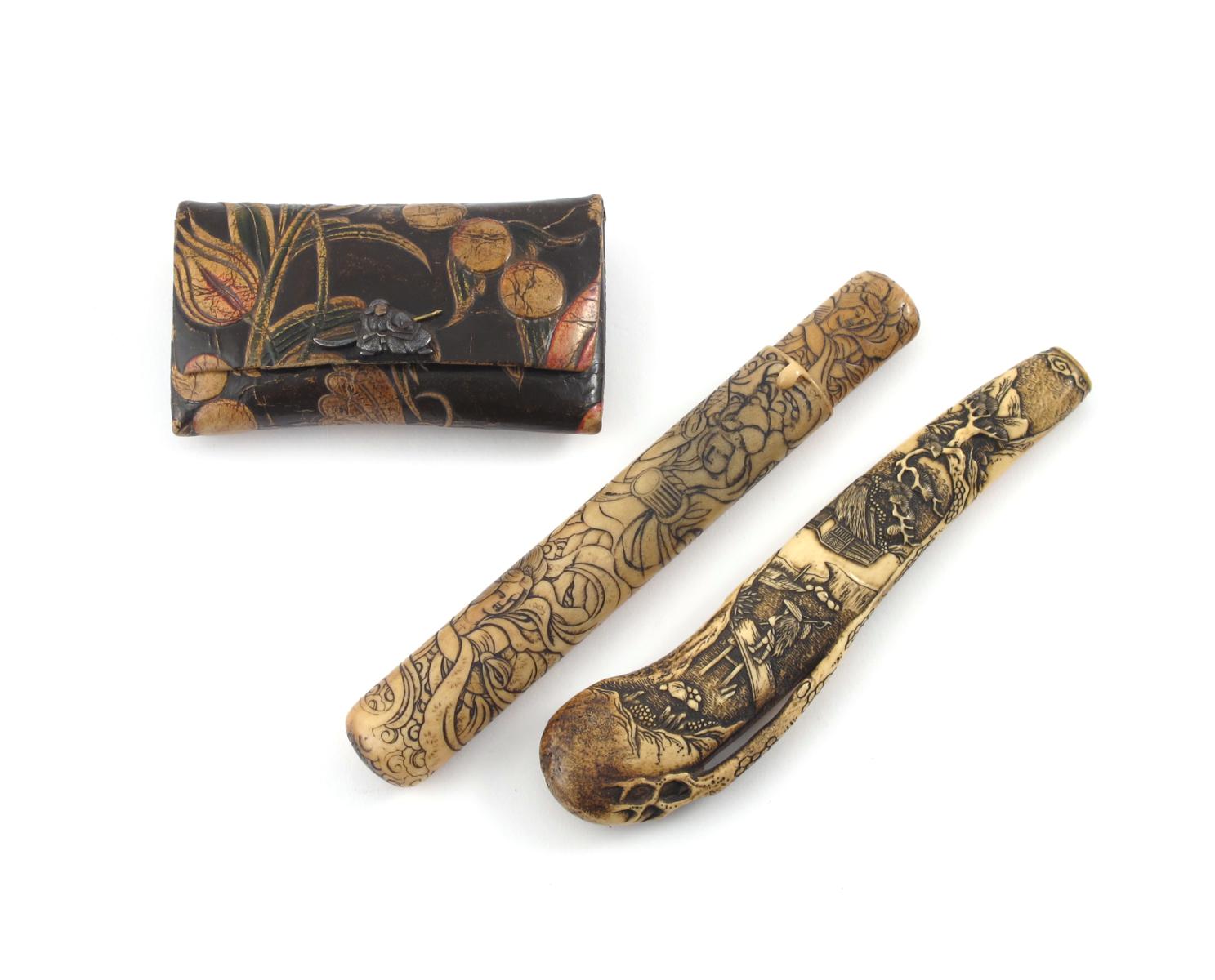 Japanese smoking accessories 19th century, comprising: two stag antler kiseruzutsu, one carved with figures in a mountainous landscape, the other with tennin and a tabako-ire made from 17th or 18th century stamped Spanish leather, with shakudo menuki, 21cm. (4)