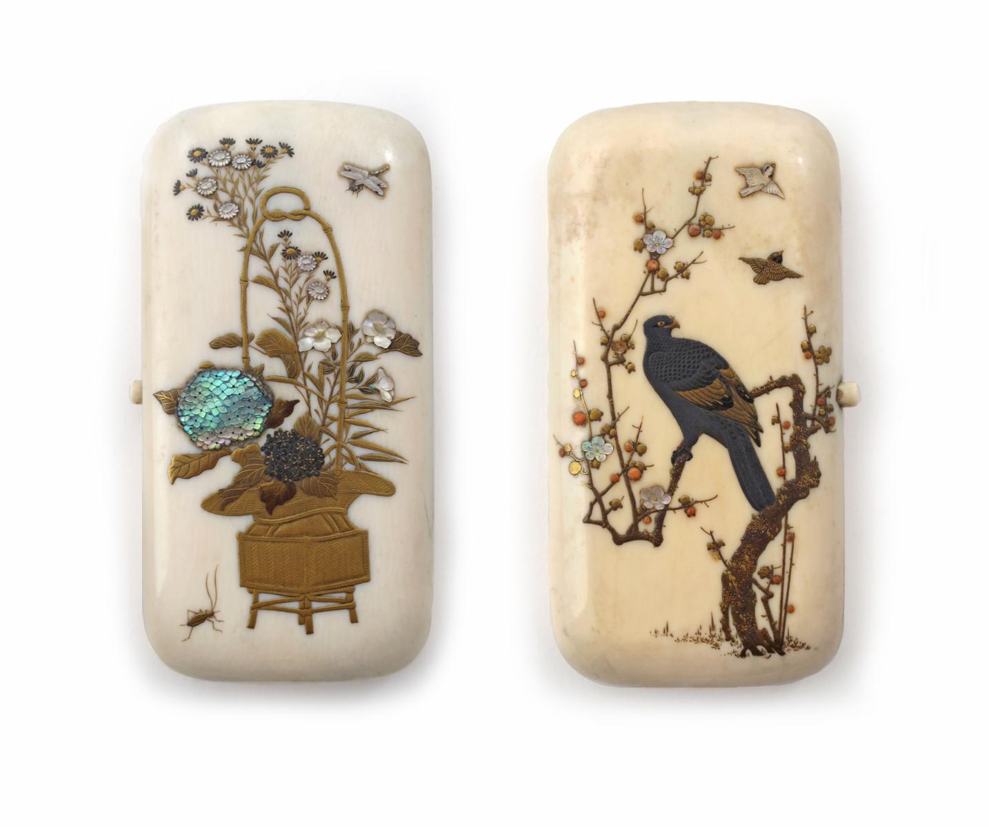 λ A Japanese Shibayama sewing box and cover Meiji 1868-1912, onlaid in mother of pearl with a jardinière of flowers and a dragonfly to one side, and an eagle perched on a prunus branch to the other, the interior fitted with sewing instruments, 11.4cm.