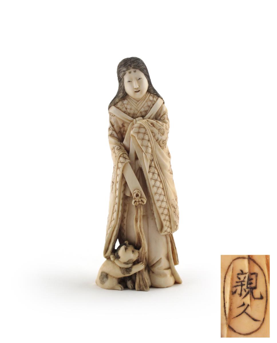 λ A Japanese ivory figure of a girl 19th century, with long hair secured in a loose ponytail, her robes with a floral scrolling design, a small cat playing with a ribbon at her feet, the base with a two character mark, 10.8cm.