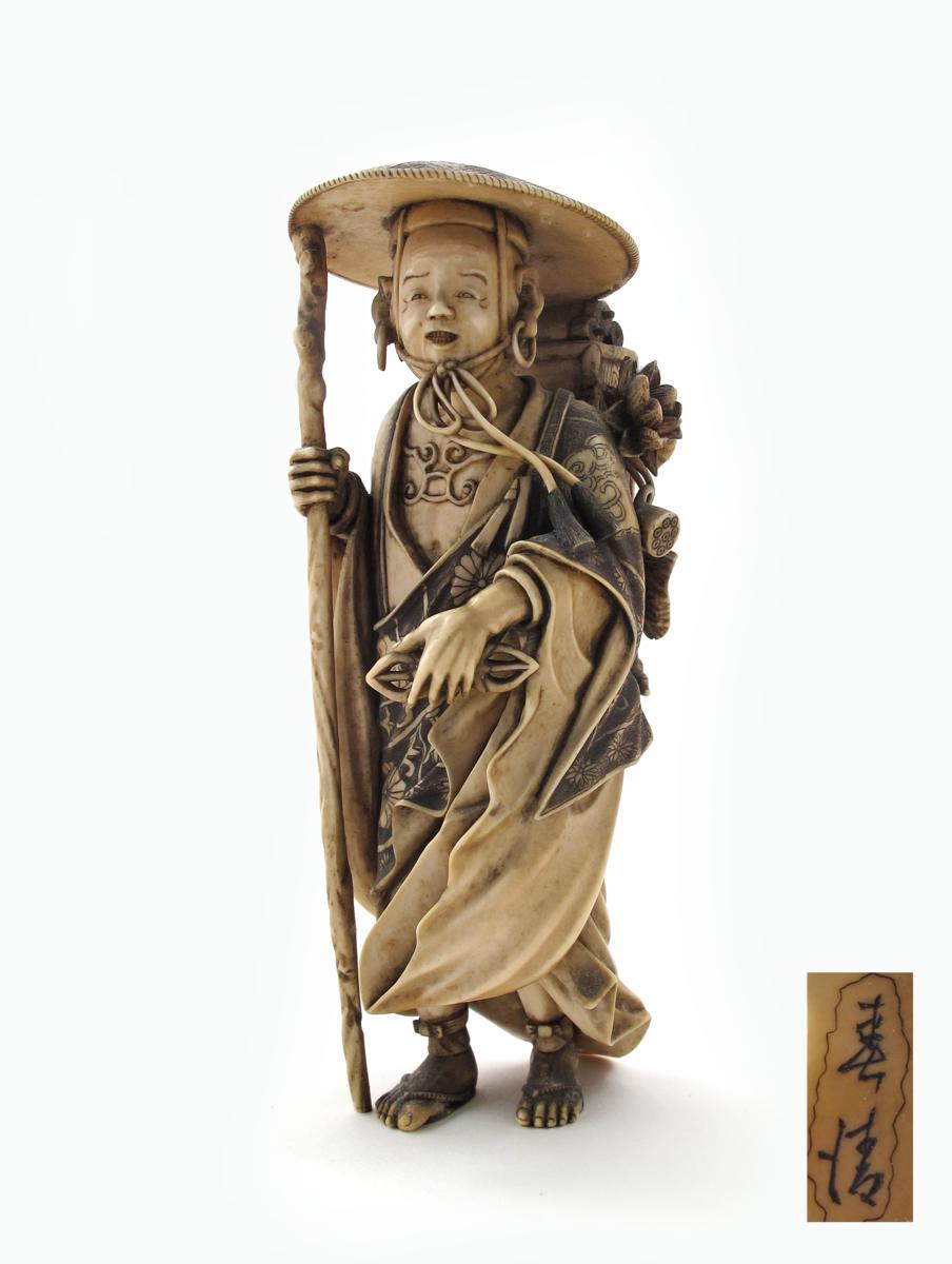λ A good Japanese ivory okimono Meiji 1868-1912, depicting an itinerant priest with a straw hat, a gnarled staff and floating robes, holding a kongo and carrying a portable shrine, lotus flowers and makimono on his back, a two character mark to the base, 12.8cm.