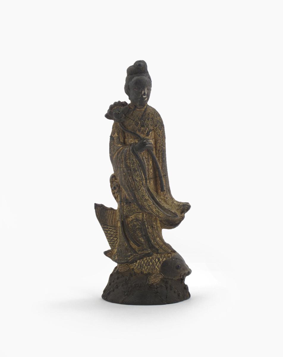 A rare Chinese ink block model of Guanyin 19th century, standing on a large carp above crashing waves, wearing long flowing robes and holding a lotus flower in her right hand, 20.8cm.