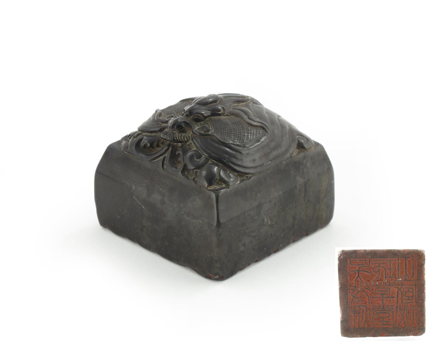 A Chinese hardstone square seal, surmounted by a large whiskered dragon carved in relief and with nine characters which read wu dai qui wan cao tang zhi cang mi, an inscription to one side which reads yi wei liu yue wu shi shang wan ke shi yi ji, 6.7cm.
