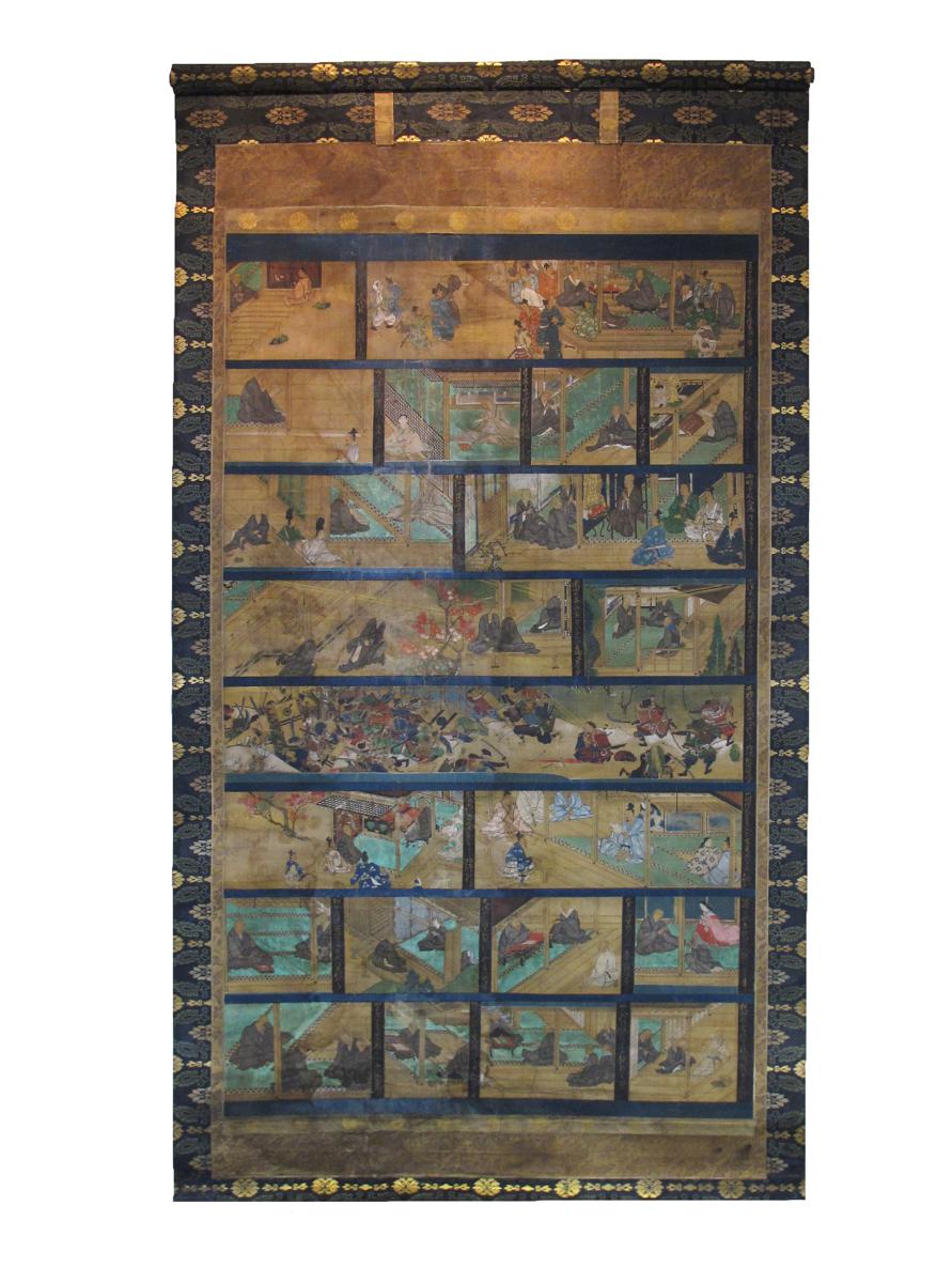 The Honen Shonin Gyojo Ezu describes the origins of the Jobo sect of Buddhism known in the West as Pure Land Buddhism. This scroll painting depicts chapters from vol. 25, scene 3, the vision of the golden Amida in Renshitsubo, vol. 26, scene 4, the Regent Hojo Tokiyori attains enlightenment, and various other scenes from vols. 26, 27 and 28.