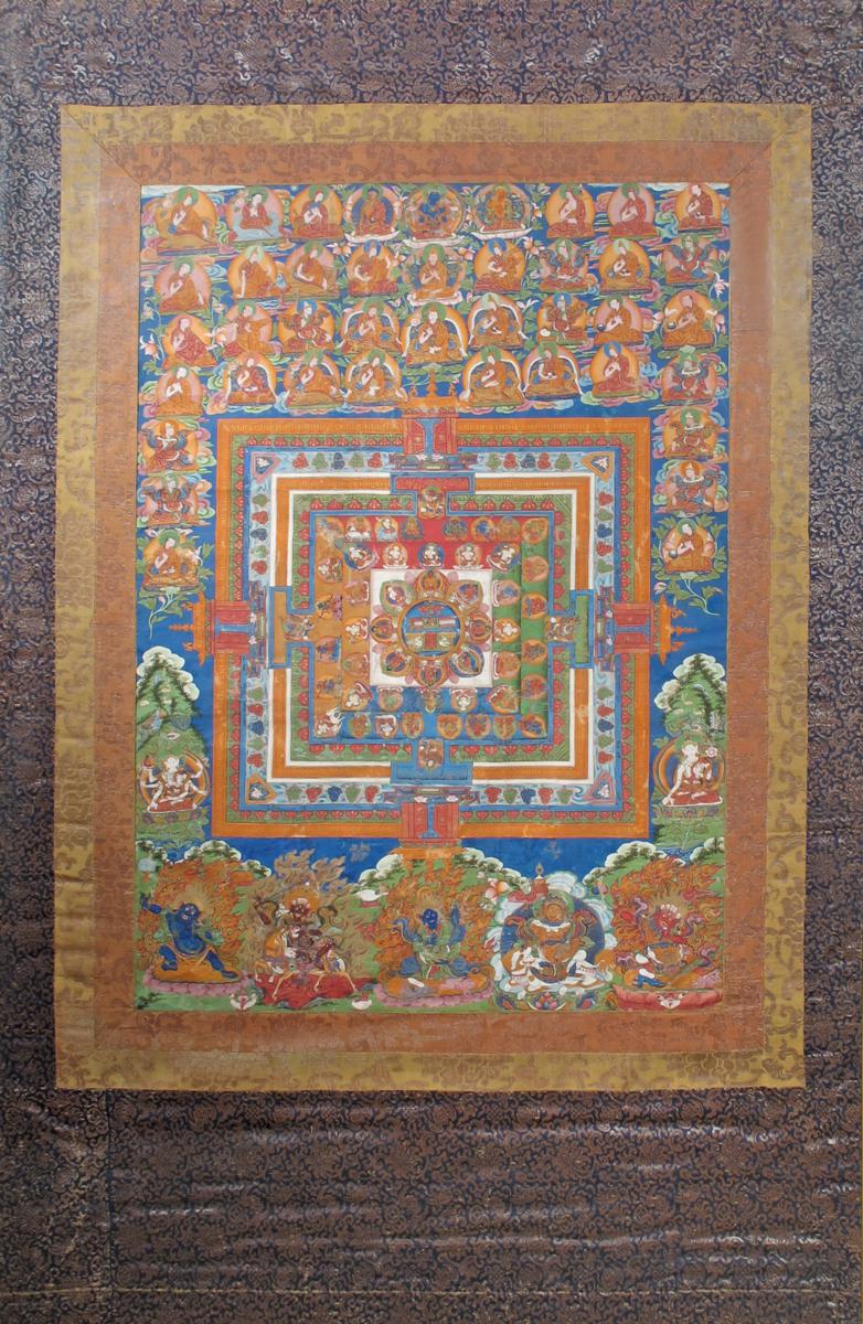 A large Tibetan Tsongkhapa mandala 19th/20th century, painted with many figures of lamas in concentric squares with further figures and above flaming deities, mounted on a silk surround, framed and glazed, 72cm x 49.5cm.