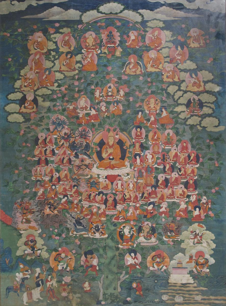 A Tibetan Buddhist Dkyil-vkhor thangka 19th/20th century, depicting many figures around a central lama in an enormous leafy tree, framed and glazed, 83cm x 58cm.