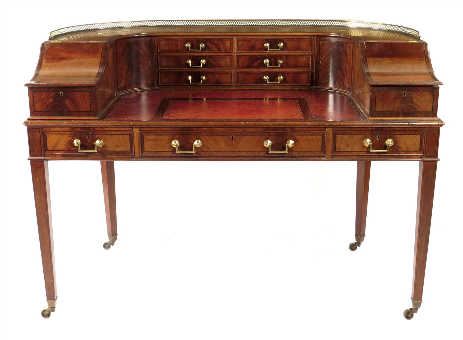 A Victorian mahogany Carlton House desk, inlaid ebonised stringing, the top with a brass gallery and two hinged brass letter slots, above six drawers and curved cupboards with a ratcheted writing slope and three frieze drawers, 40¾in (102cm) high, 56¼in (142.5cm) wide, 31½in (79.8cm) deep.