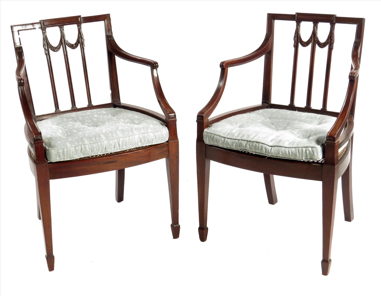 A pair of mahogany open armchairs in Sheraton style, each with a triple bar back draped with swags to a cane seat with squab cushion, late 19th / early 20th century. (2)