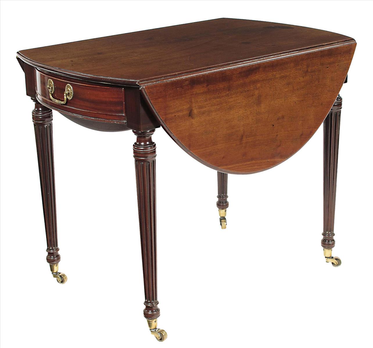 A late George III mahogany Pembroke table, the oval moulded edge drop-leaf top above two bowfront end frieze drawers, fitted cast brass handles, on turned tapering and fluted legs to brass caps and castors, 28.75in (73cm) h, 23.5in (59.5cm) w, 36.25in (92cm) d, closed.