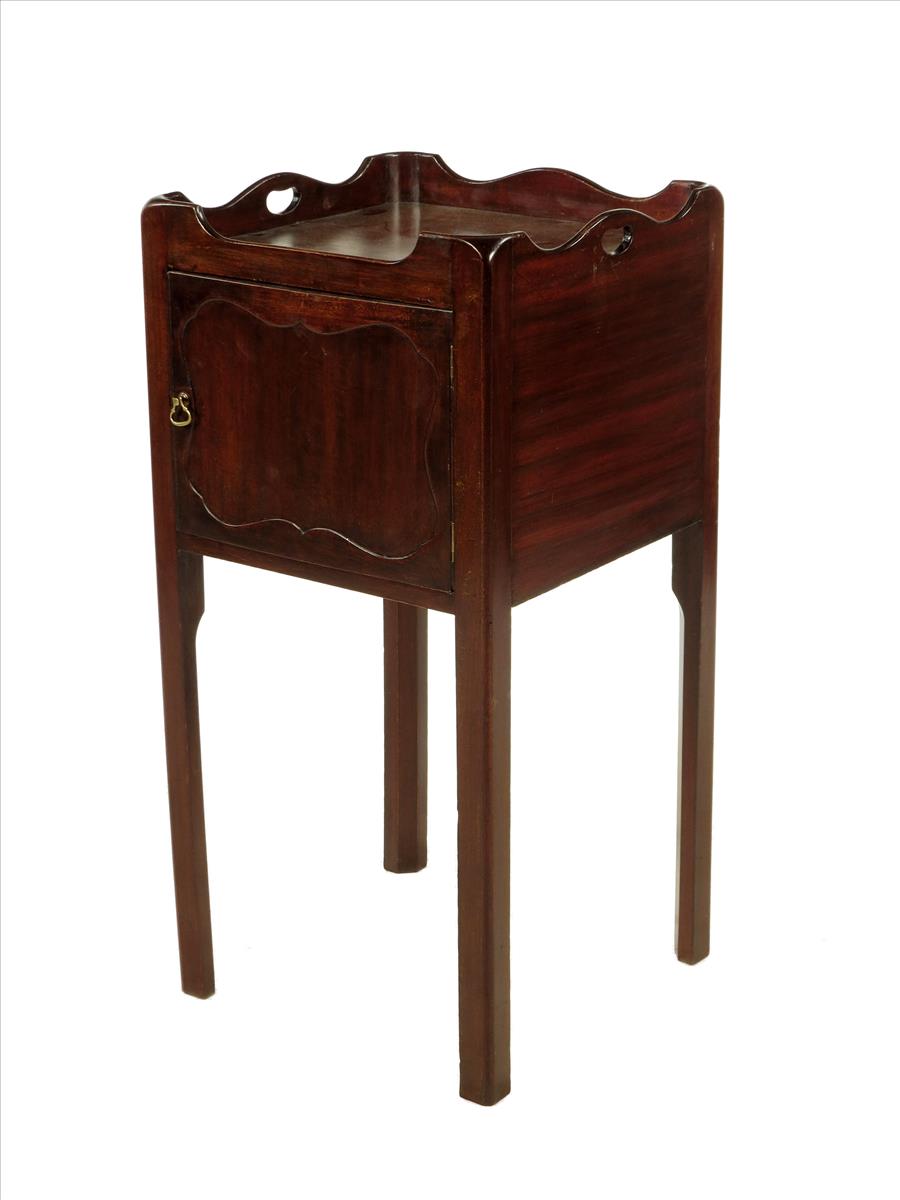 A mahogany bedside cupboard, with a wavy edge gallery pierced with two handgrips, 29½in (75cm) high, 14½in (36.3cm) wide, 14¼in (36.1cm) deep.
