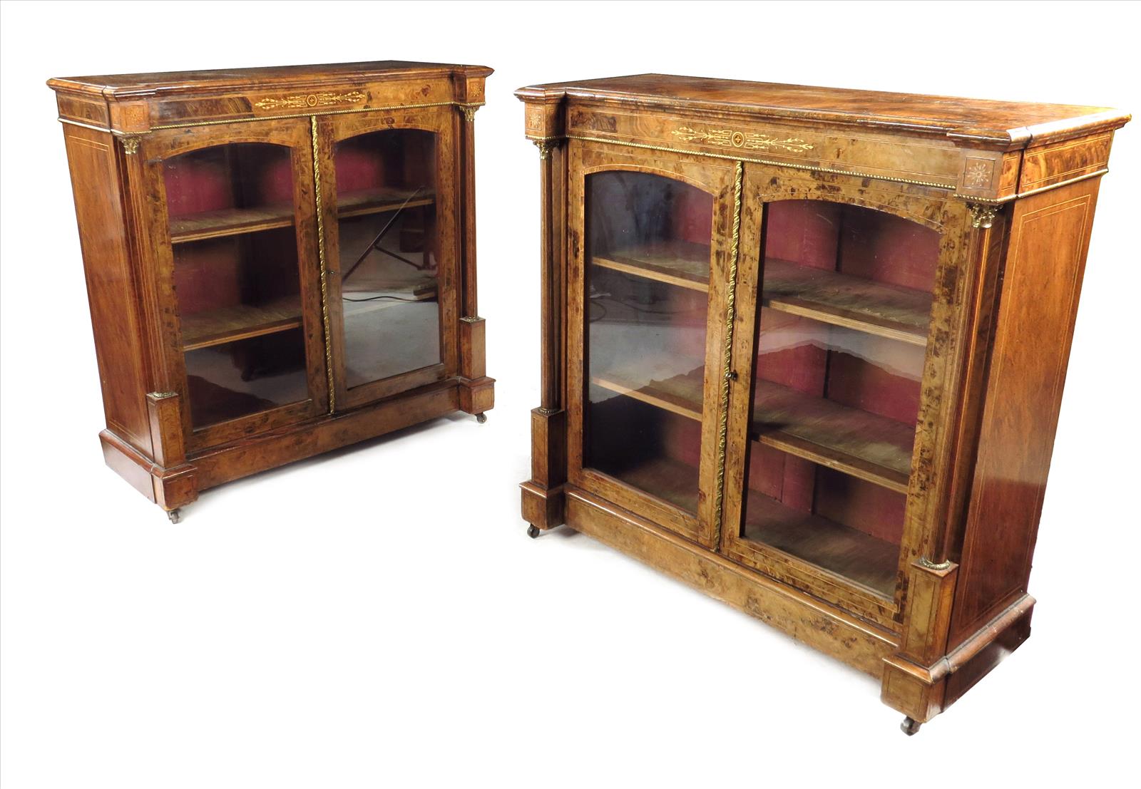 A pair of Victorian walnut and marquetry glazed bookcases, each with an inverted breakfront, with a pair of Corinthian capital columns to a pair of doors enclosing two plush lined shelves, on castors, 42in (106.3cm) high, 42in (106.6cm) wide, 16in (40.5cm) deep. (2)