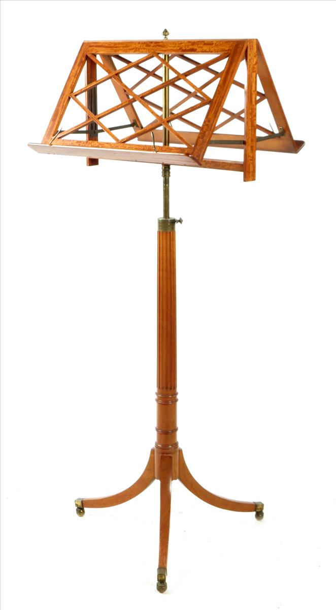 A 19th century satinwood and brass mounted duet music stand, after a design by Sébastien Erard, the adjustable lattice top on a fluted stem and tripod splay legs, terminating in brass caps and leaf capped ball feet, 61in (155.2cm) high, max, 19¾in (50.3cm) wide.