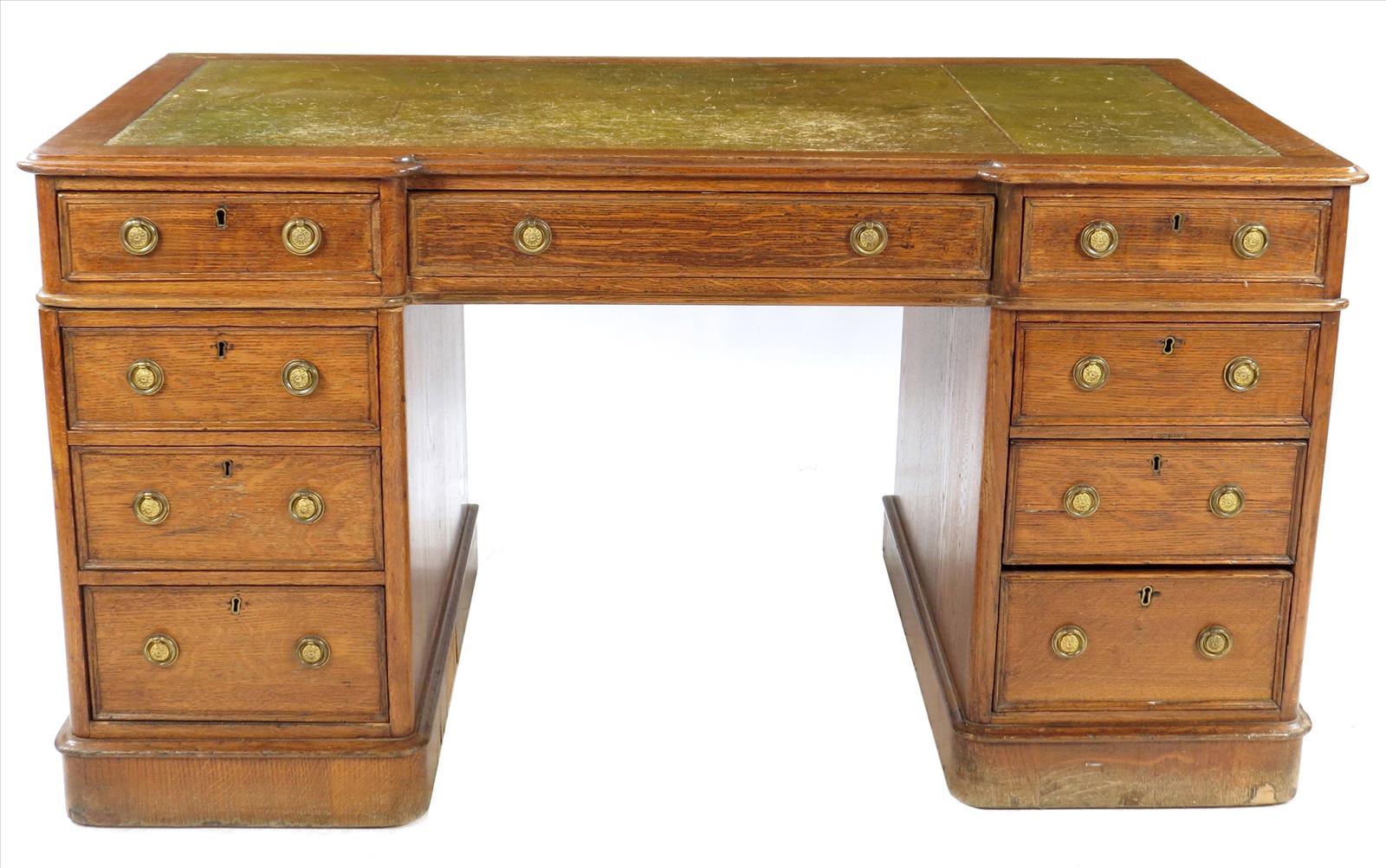 A late Victorian oak twin pedestal desk, the breakfront with an arrangement of nine drawers, the central drawer replaced, 28¾in (73cm) high, 54in (137cm) wide, 29¾in (75.5cm) deep.
