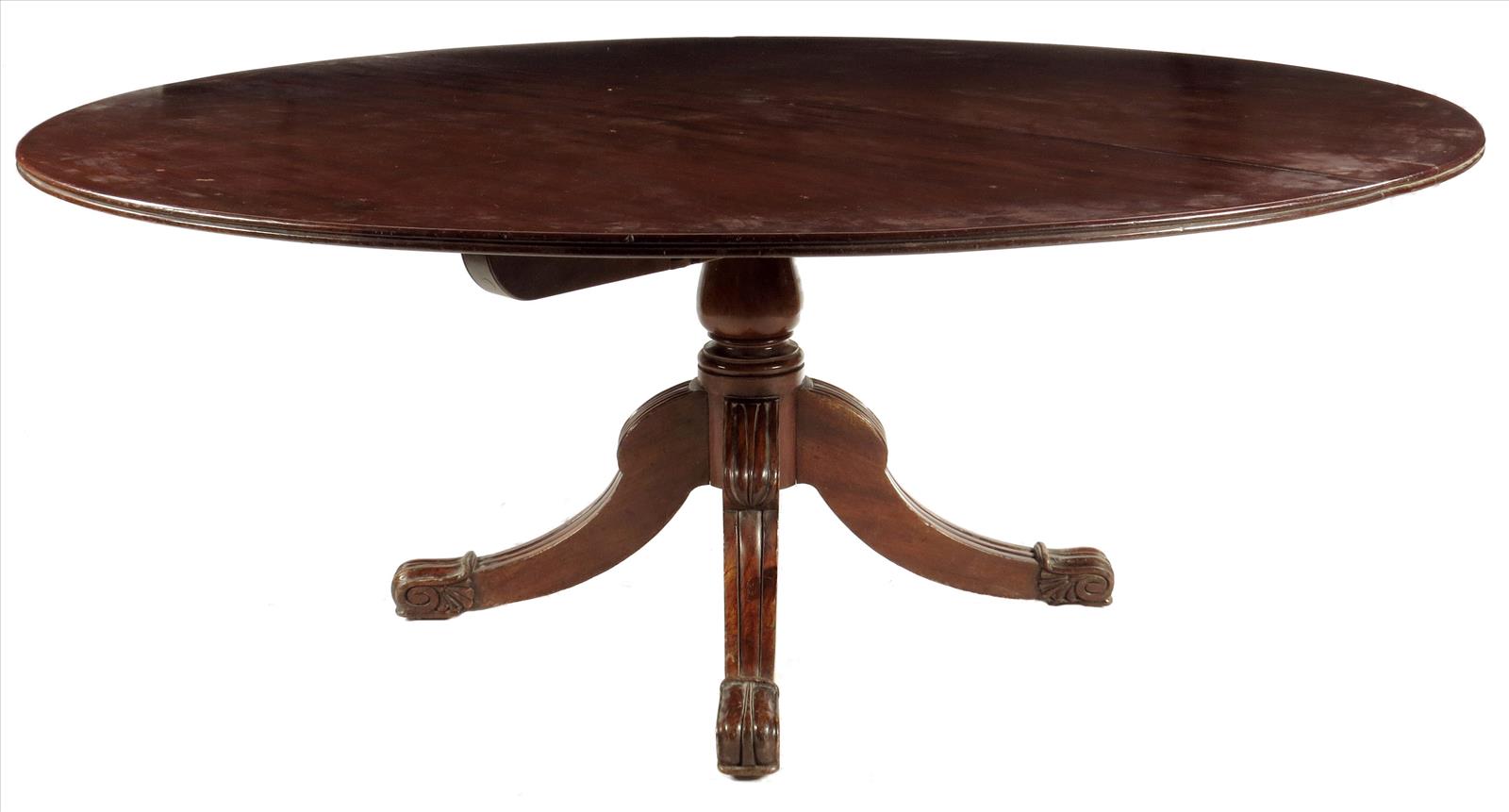 A mahogany centre table, the circular tilt-top with a reeded edge on a baluster stem and lappet scroll legs, with palmette and scroll carved feet with sunken brass castors, 29in (73.6cm) high, 72in (183cm) diameter.
