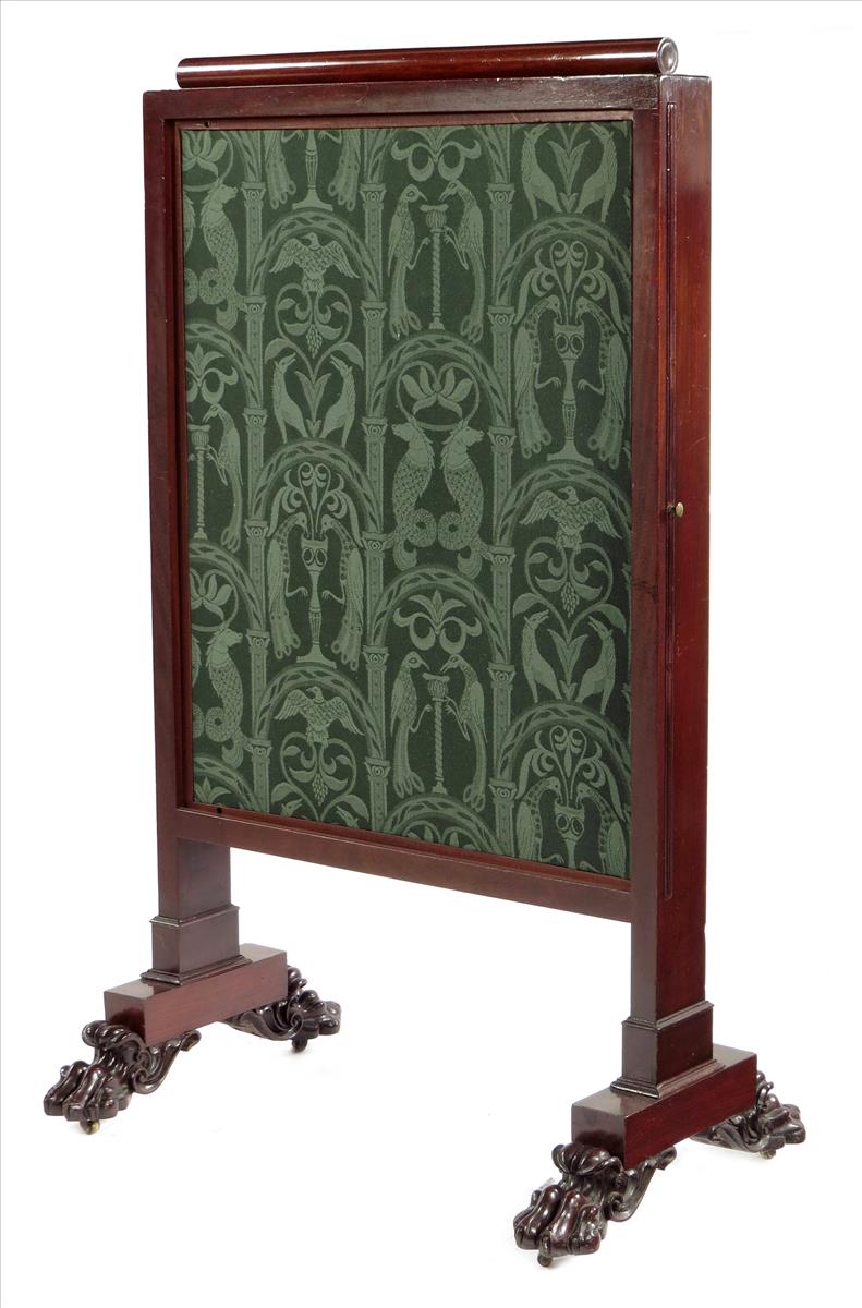A William IV mahogany firescreen, with a lift-up panel having a batton top and two side panels, on carved paw feet and brass castors, 45¼in (115cm) high, 28¼in (71.6cm) wide, 18in (45.6cm) deep.