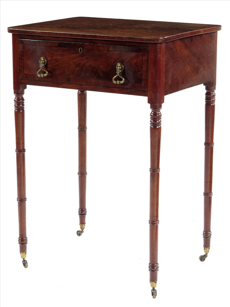 An early 19th century mahogany work table, the drawer with crossbanding and ebonised stringing and later handles, the cedar lined interior previously partitioned, 29¾in (75.5cm) high, 21¼in (54cm) wide, 16in (40.5cm) deep.