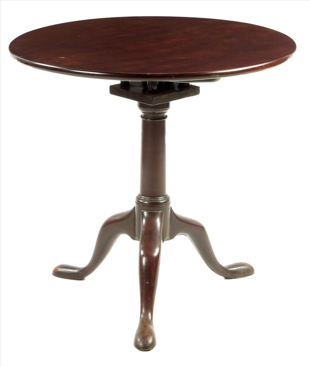A mid 18th century mahogany tripod table, the circular tilt-top revolving on a bird cage, 25½in (64.6cm) high, 26in (66cm) diameter.