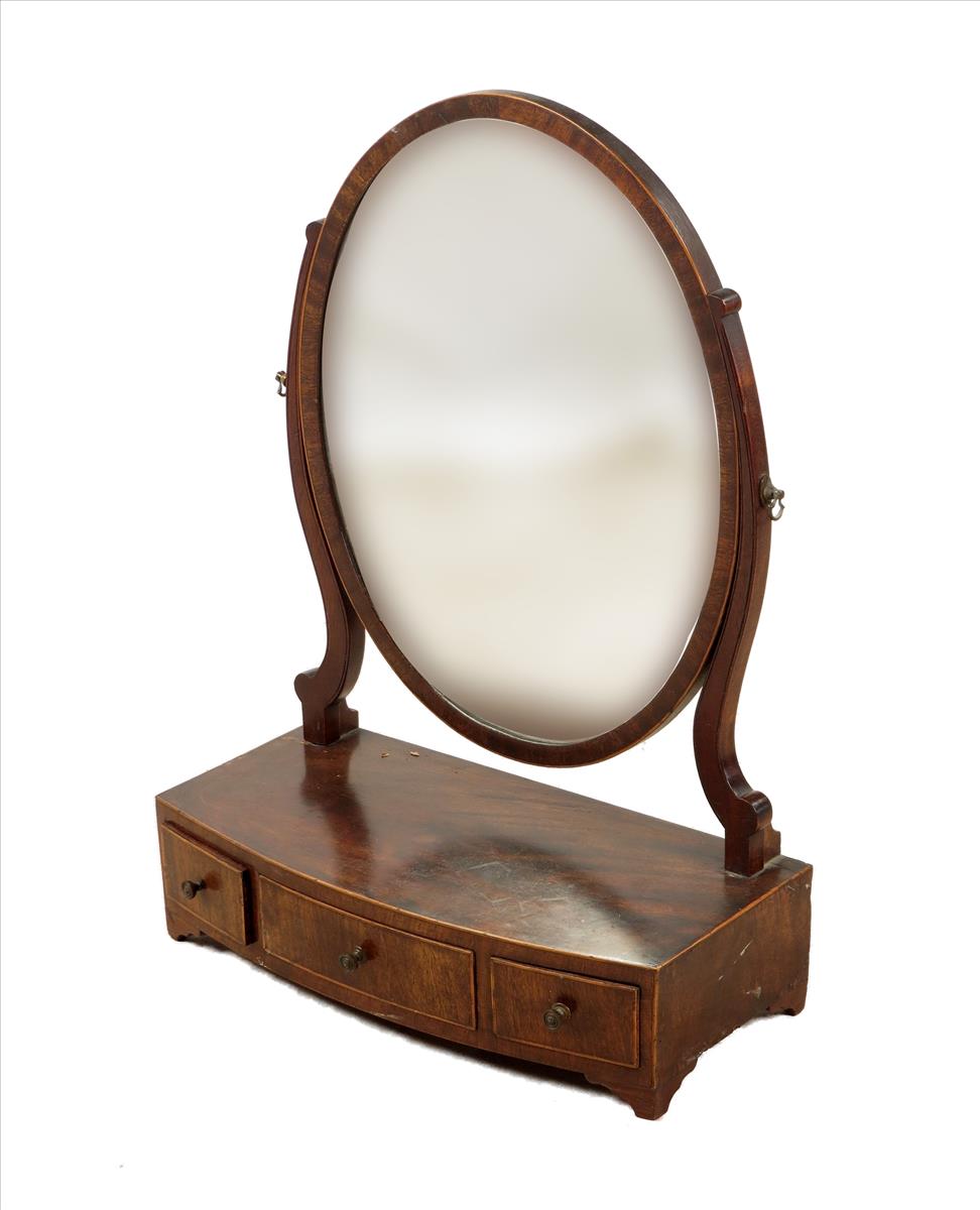 A 19th century mahogany toilet mirror, with boxwood edging, an oval plate and bowfront base, with three drawers, 24½in (62cm) high, 17½in (44.5cm) wide, 8½in (21.5cm) deep.