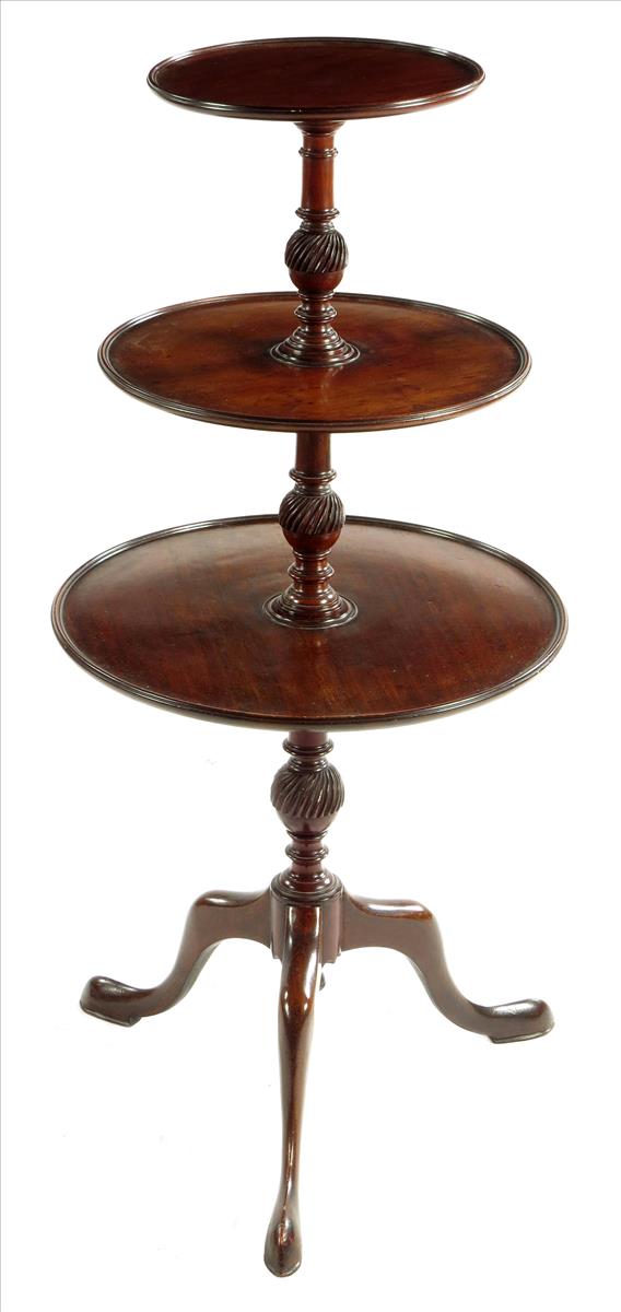 A mahogany dumb waiter, with three graduated dished tiers, two revolving, on tripod supports, 42¼in (107.2cm) high, 20½in (52cm) wide.