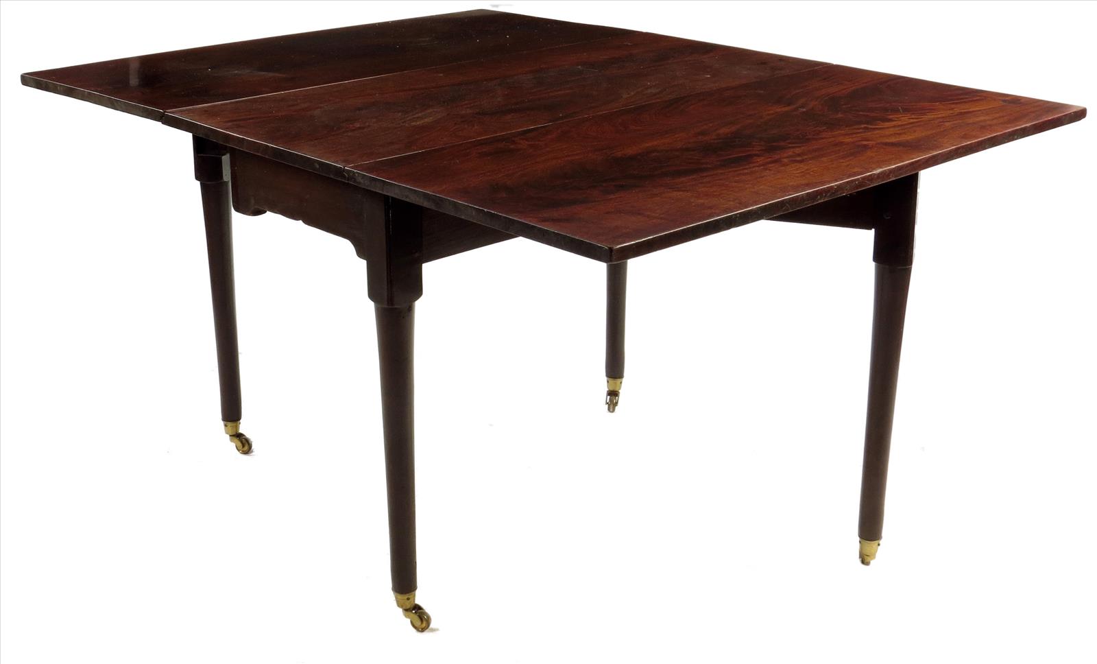 A mid 18th century mahogany drop-leaf table, on later brass castors, 29¼in (79.4cm) high, 41¾ x 53¾in (106 x 136.3cm).