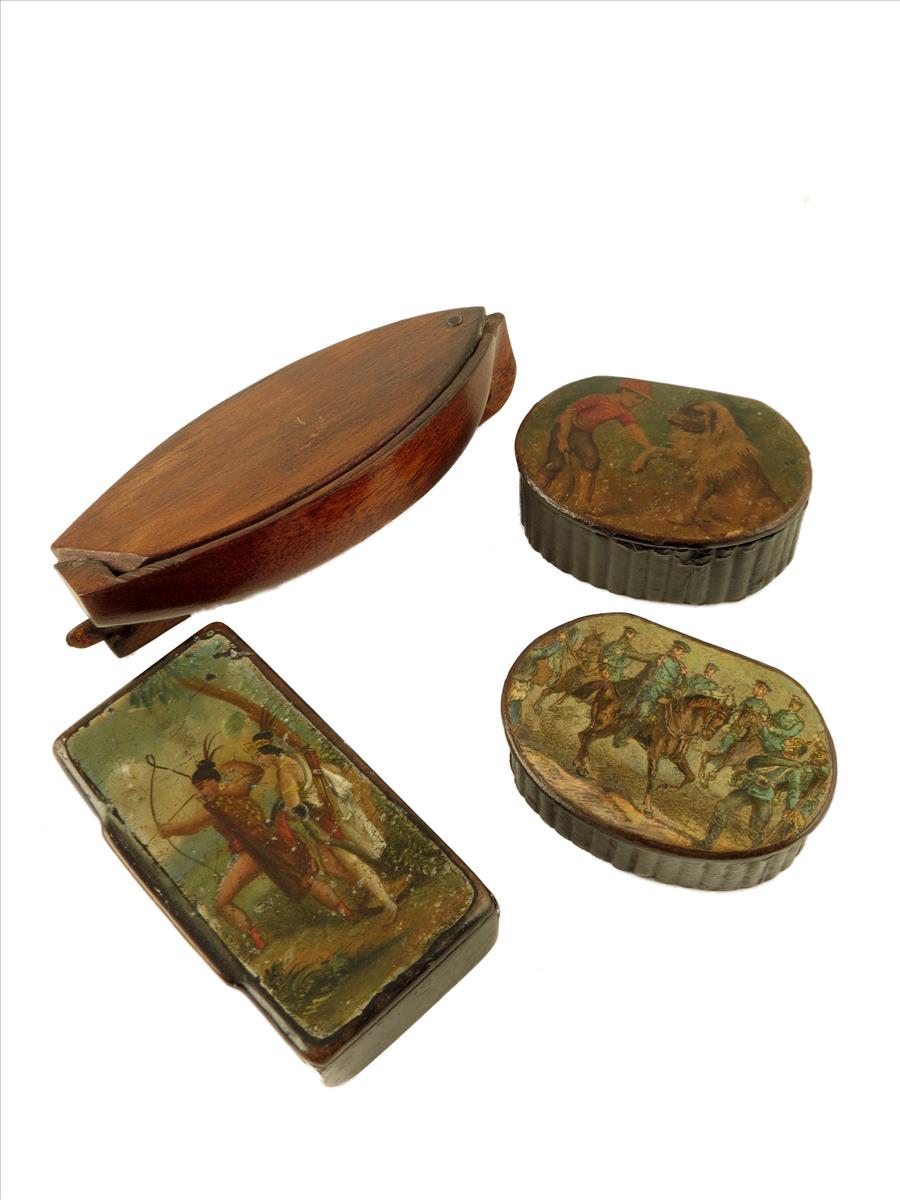 A mahogany snuff box, modelled as a boat, the brass rudder, 4½in (11.4cm) long, and three 19th century papier mache snuff boxes; two with printed covers, a boy holding a dogs paw, a German military equestrian scene, 2¼in (5.7cm) wide, and a painted scene of two South American natives, 3in (7.6cm) wide. (4)