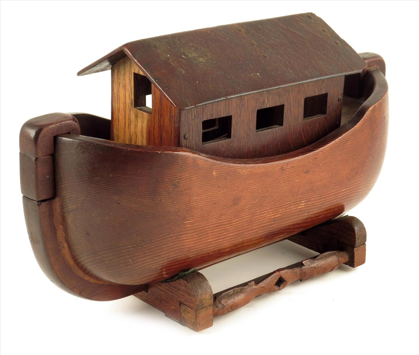 A 19th century oak and pine Noah's ark, with a detachable roof and frame with a locking clip, on a stand carved with fish, 9¾in (24.3cm) high, 15¾in (39.7cm) wide.