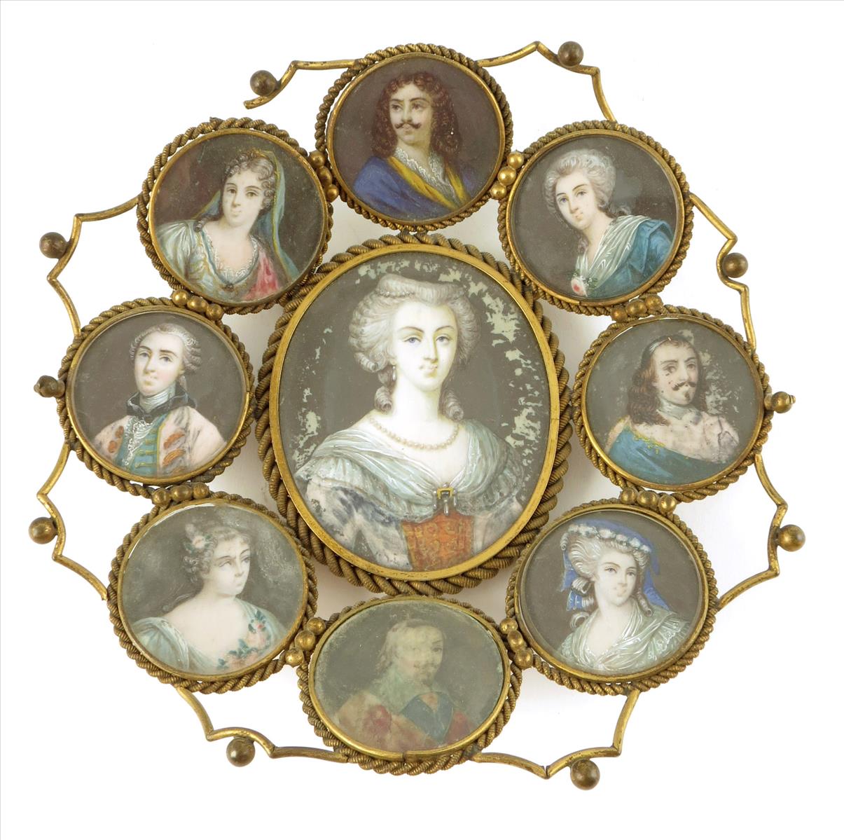 λA group of nine portrait miniatures, monarchs and queens, mounted in a gilt brass basket, handle missing, the central oval 4¼ x 3½in (10.8 x 9cm) with tortoiseshell backs, two missing, 9in (23cm) diameter.