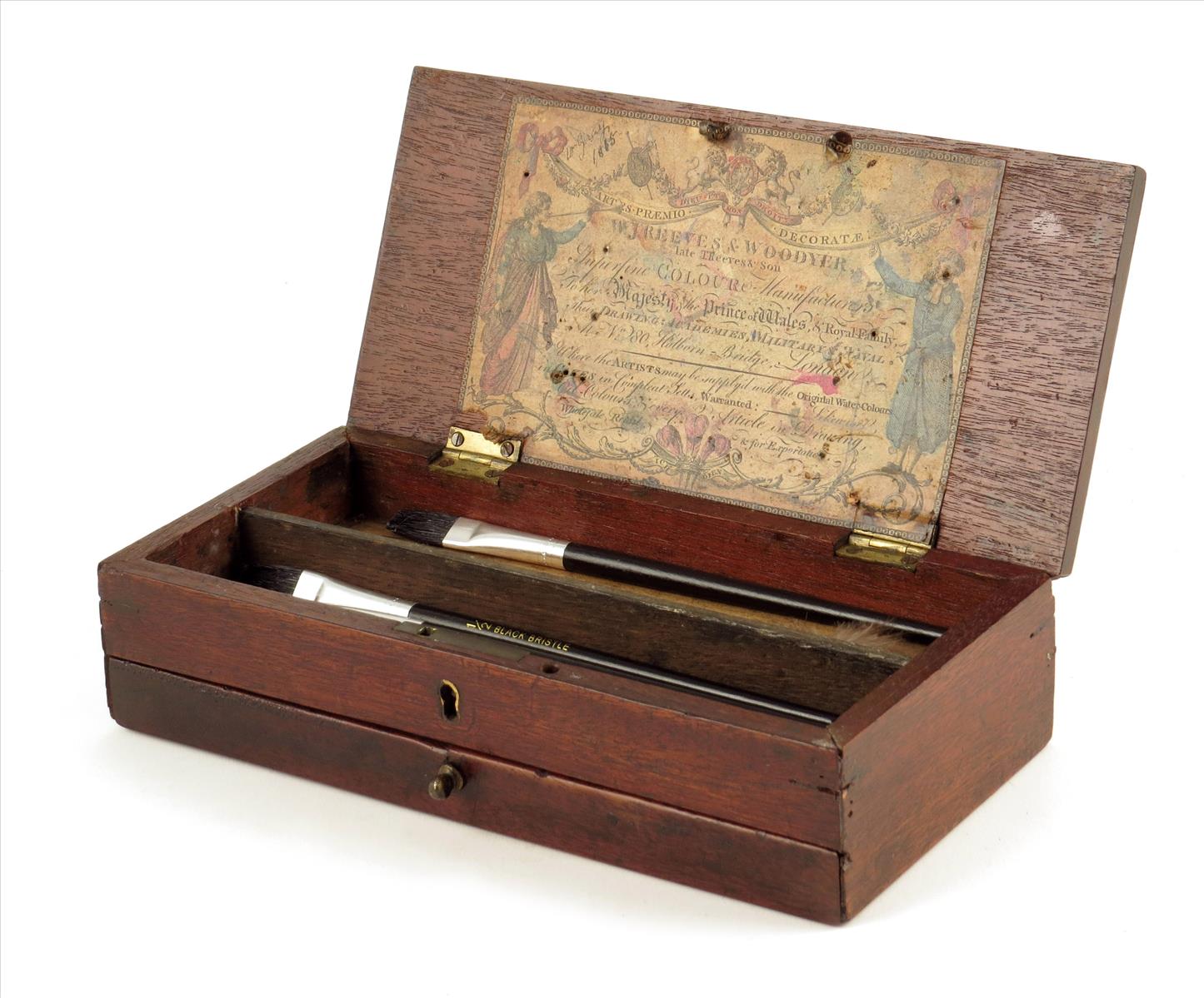 An early 19th century mahogany paint box, with barber's pole stringing to the hinged cover, with a printed trade label for 'W.J.REEVES & WOODYER, late T.Reeves & Son...' with a single division and a drawer below, 2¼in (5.6cm) high, 8¾in (22.2cm) wide, 4¼in (10.7cm) deep.