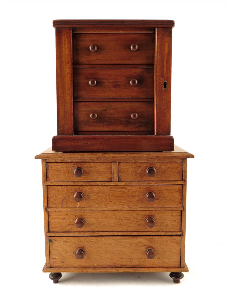 A late Victorian mahogany miniature Wellington chest, of three drawers with a locking pilaster, 10¾in (27.2cm) high, 9¾in (24.5cm) wide and a 19th century oak miniature chest, possibly an apprentice piece,11¾in (29.5cm) high. (2)