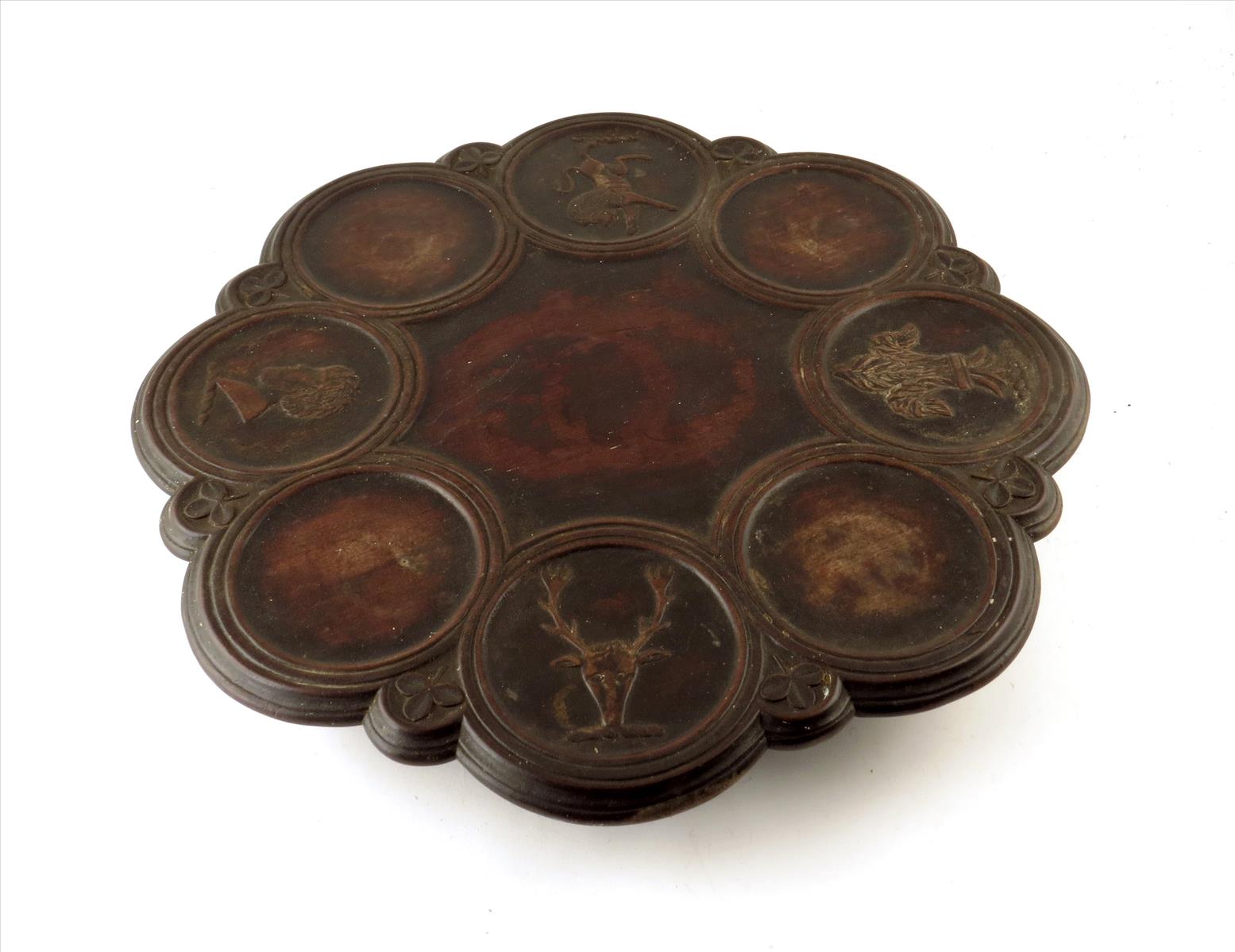 A 19th century mahogany lazy susan, in the manner of William Harrison, the top with eight rondels and carved with a rampant lion, a stag's head, a portrait bust and a plume of feathers, on a pierced base, 3½in (8.5cm) high, 24in (51cm) diameter.
