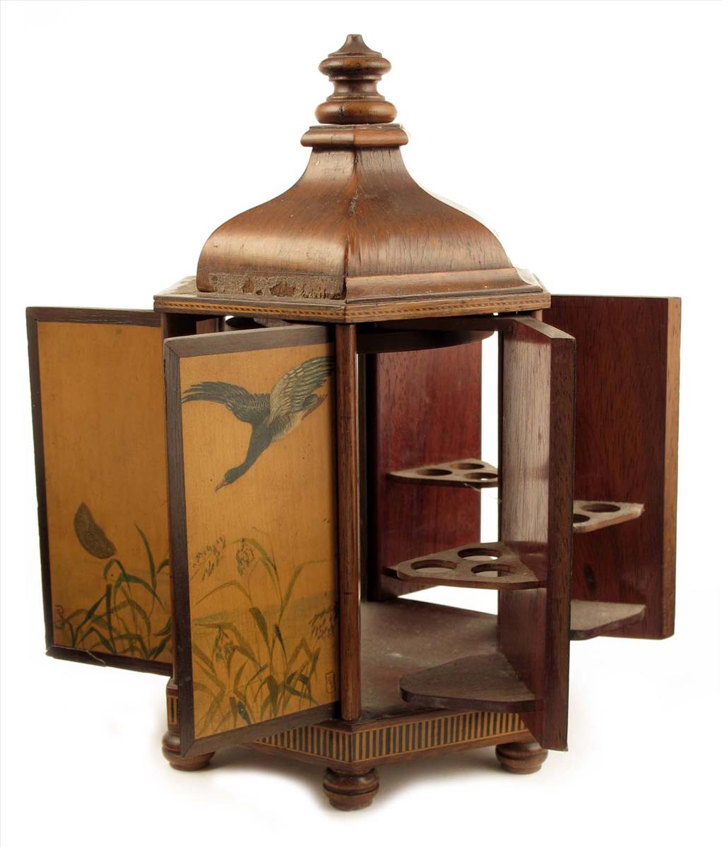 A Victorian walnut mechanical cigar dispenser, the turned finial twists to open six Japonisme painted panel doors with apertures for three cigars, 12¼in (31cm) high, 7¼in (18.3cm) wide.