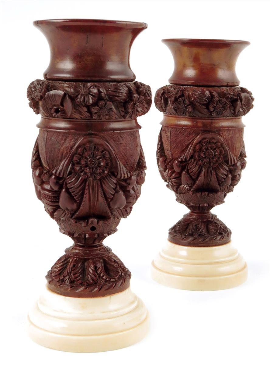A near pair of 19th century carved coquilla nut urns, each with a band of flowers and foliage above swags of fruit and flowers, on ivory plinths, 5½in (14cm) high, max. (2)