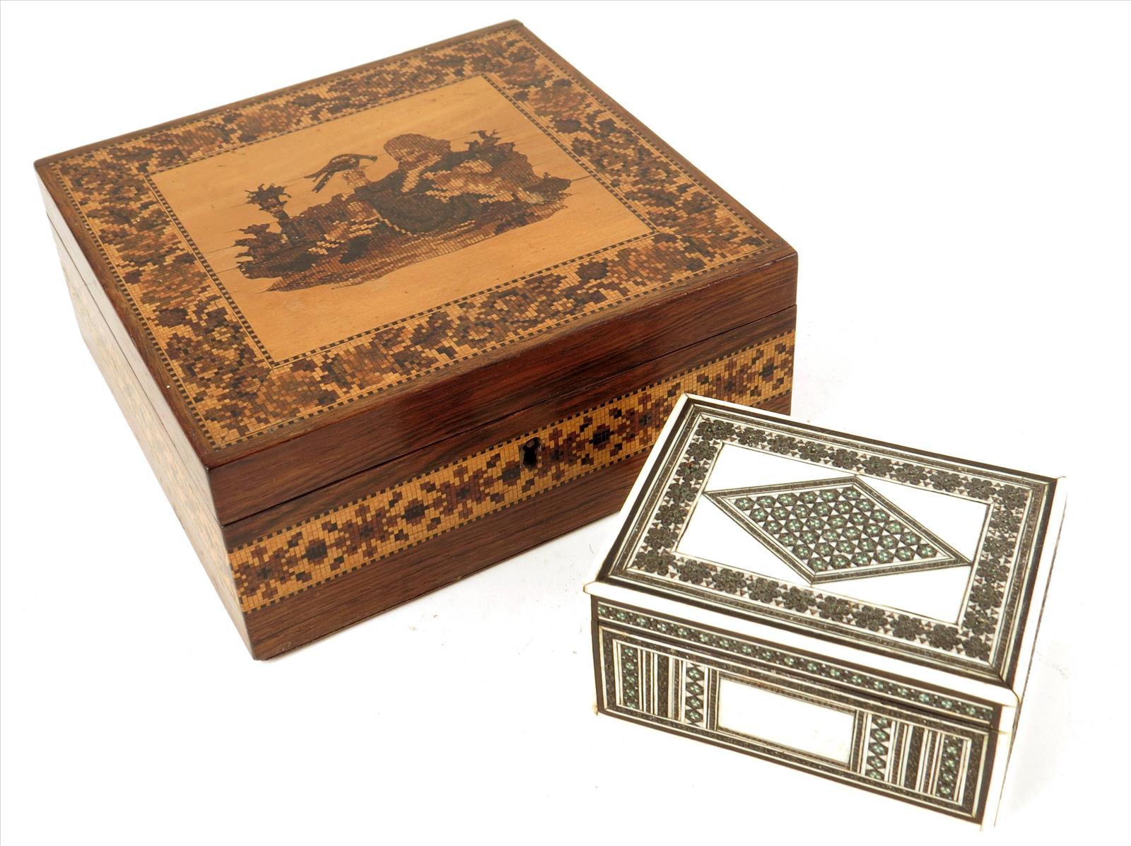 λA Victorian Tunbridge Ware rosewood square box, the cover inlaid a reclining figure with a bird and animal, the interior with padded silk linings, the brass hinges stamped 'MOORE CISTERE, SEPR 27 1843,' 2½in (6.4cm) high, 6in (15.2cm) square, and an Indian ivory and sadelli work rectangular box and cover, 3½in (9.2cm) wide. (2)