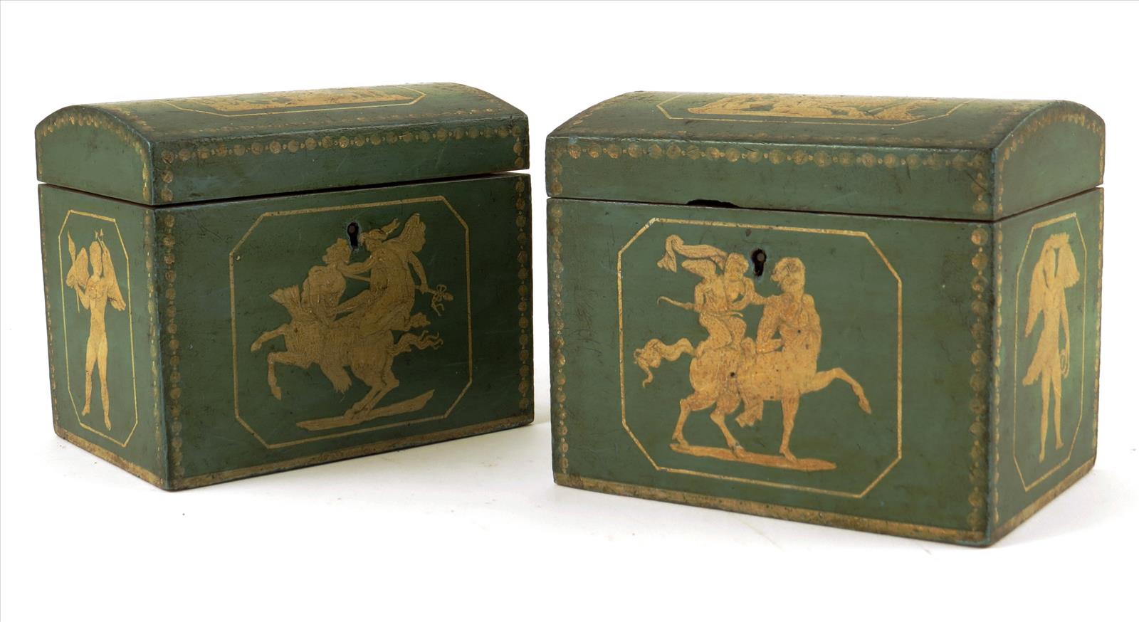 A pair of Regency style painted pine tea caddies, each with a domed lid and decorated with classical panels of figures, to paper lined interiors, 4¼in (10.5cm) high, 5¼in (13cm) wide. (2)