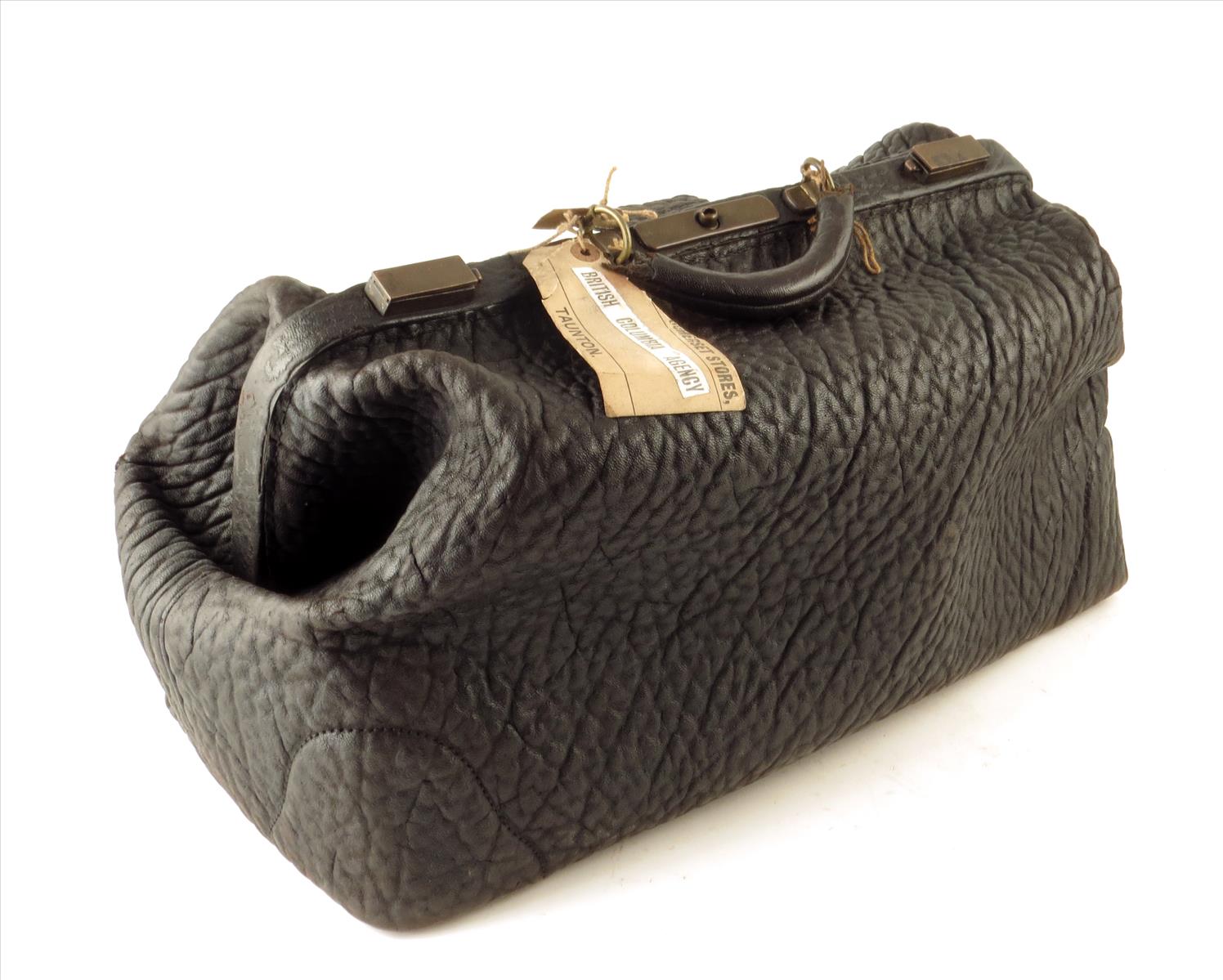 An early 20th century walrus hide Gladstone bag, with brass fittings, possibly American, the base marked 'GENUINE SEAL WALRUS PAT'D DESIGN 30 45X', 22½in (56.7cm) wide.
