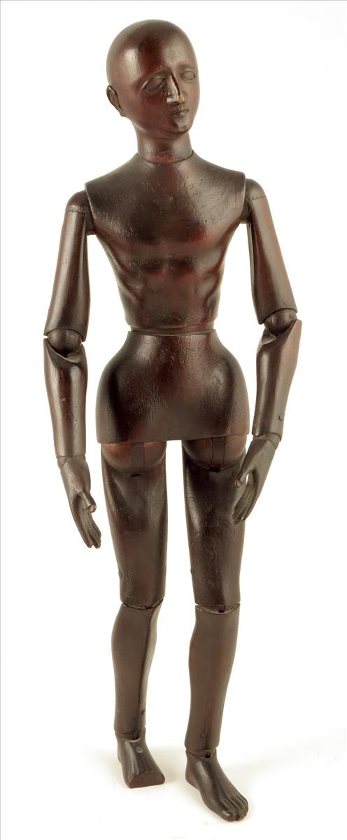 A European stained wood artist's lay figure, with a carved head and articulated joints, right toes missing, 22½in (57cm) high.