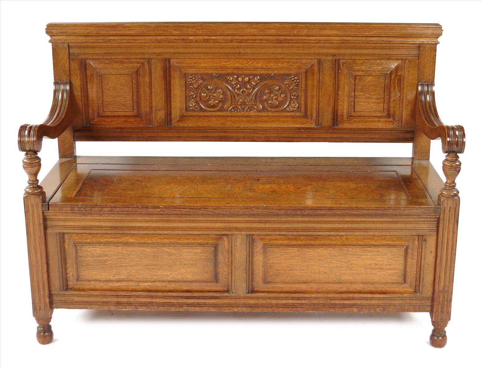 A late Victorian carved oak settle, with a hinged seat, 35in (89cm) high, 49¼in (125cm) wide, 19½in (49.5cm) deep.