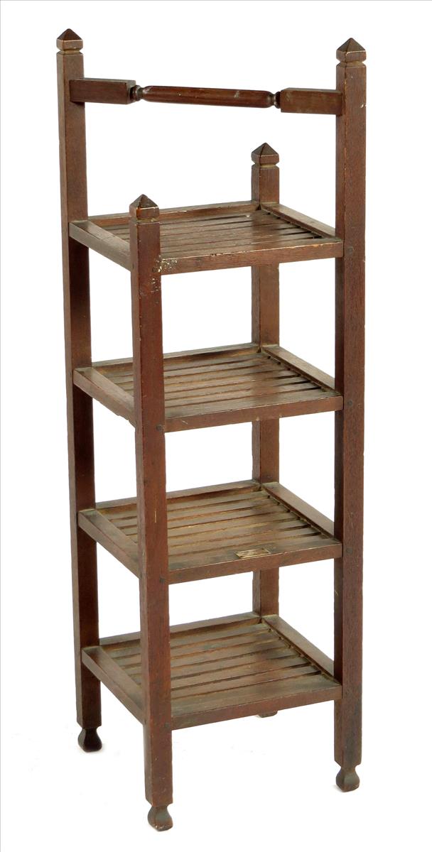 A ship's teak four tier whatnot, with an ivorine plaque 'Hughes, Bolckow & Co Ld MANUFACTURERS, BATTLESHIP WAR BLYTHE', 38¼in (97cm) high, 11½in (29.2cm) square.
