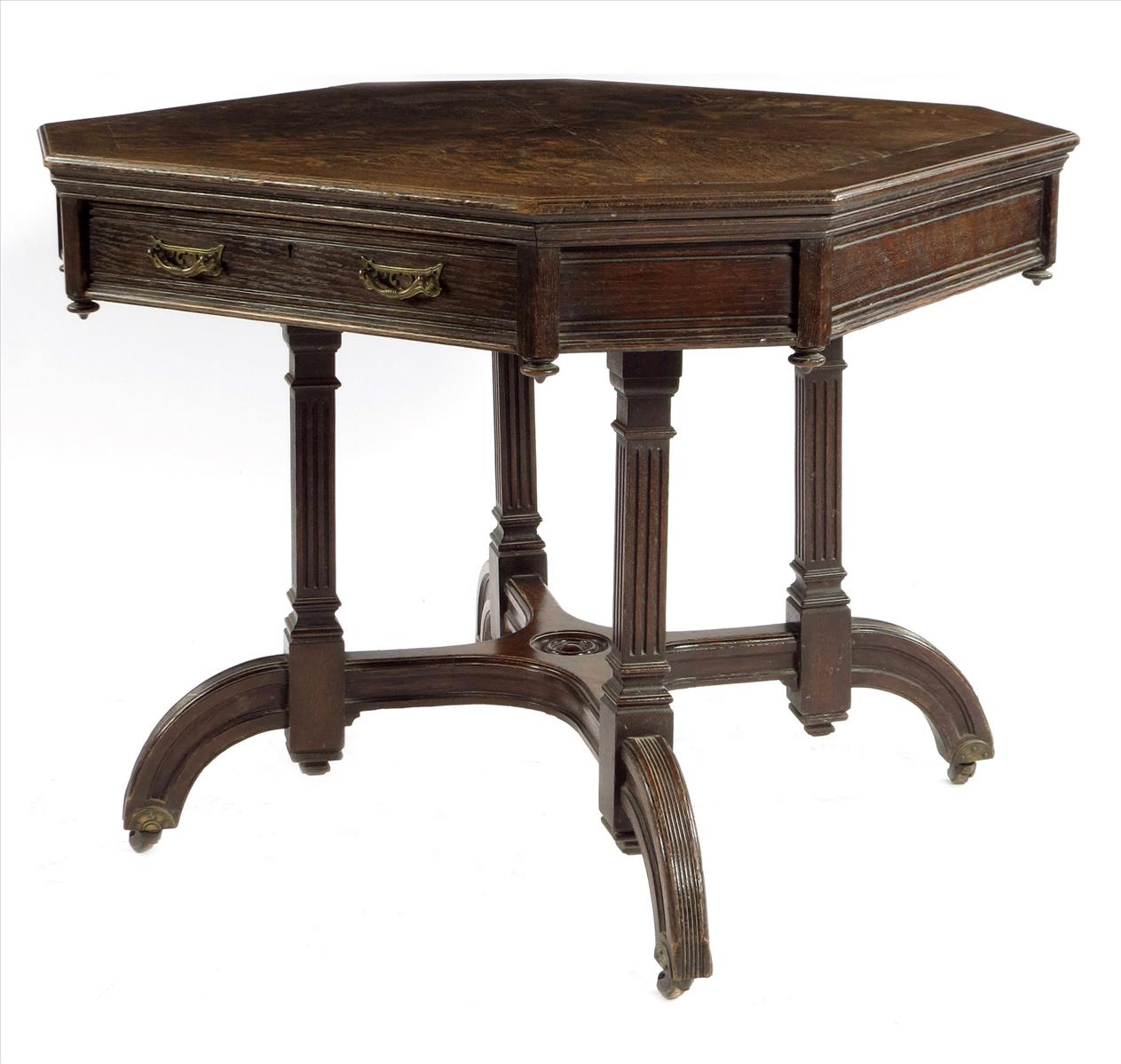 A late Victorian oak centre table, the octagonal top with two frieze drawers with Hobbs & Co brass locks, the pierced brass plates with registration lozenge for 28th March 1882, and on quadruple square column supports to an 'X' stretcher, on reeded scroll legs with brass crescent sabots and castors, 29¾in (75.5cm) high, 36in (91.4cm) wide.