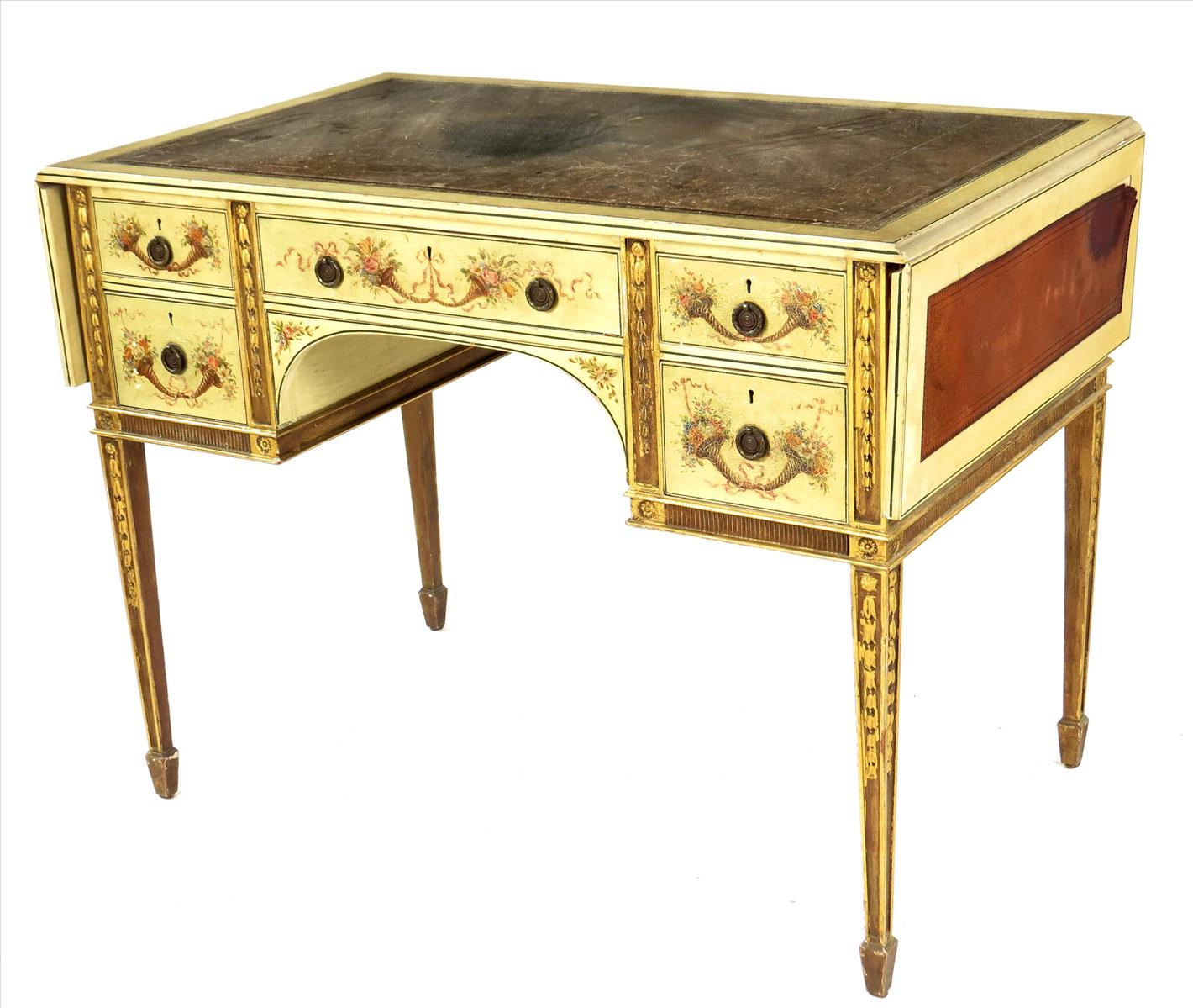 A late Victorian painted and parcel gilt writing table in Adam style, with a leather inset twin-flap top, the drawers with Hobbs & Co. London brass locks, 30in (76.2cm) high, 40¼in (102cm) closed, 24in (61cm) deep.