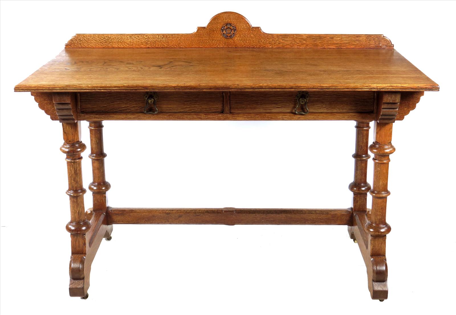 Gillows, Lancaster. A Victorian oak writing table in the manner of A.W.N. Pugin, the raised back centred a carved rosette, above a pair of frieze drawers, the right drawer stamped 'GILLOWS LANC.....', on ring turned legs and castors, 35¾in (85.3cm) high, 48in (121.8cm) wide, 26in (66cm) deep.