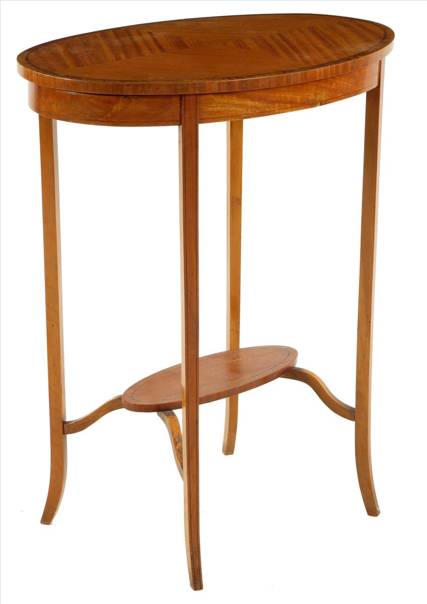 λA late Victorian satinwood oval occasional table, the quarter veneered top with a rosewood banded edge, 27¾in (70.3cm) high, 24in (60.7cm) wide.