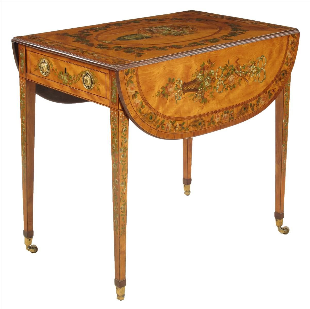 A late Victorian satinwood and painted Pembroke table, with kingwood and tulipwood crossbanding, decorated a vase and baskets of flowers, ribbons, trophies, vines and peacock feathers, above a frieze drawer and false reverse with replaced handles, the legs with applied ankles with brass castors, 28½in (72.5cm) high, 39in (99cm) wide open, 31in (78.6cm) deep.