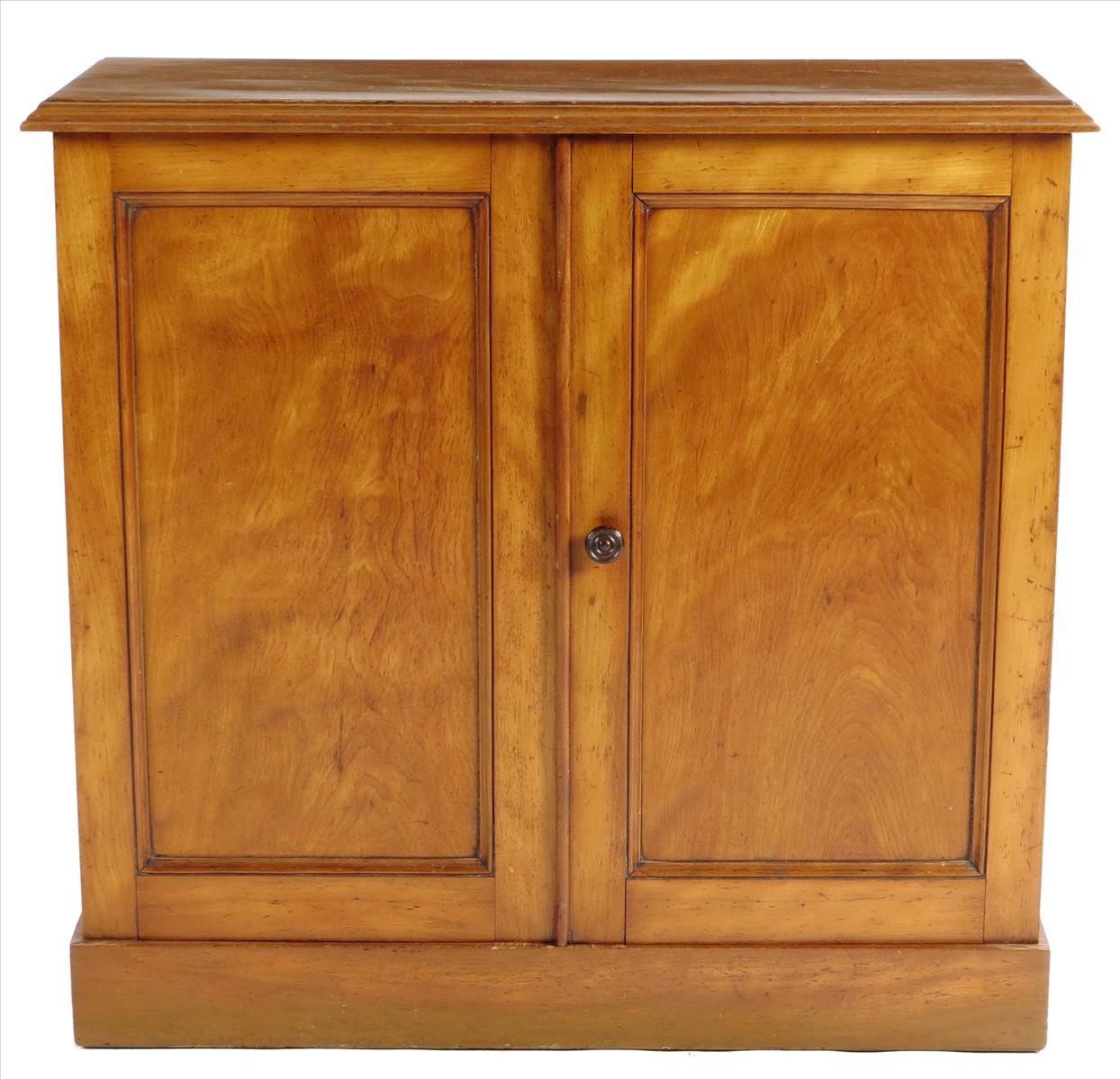 A Victorian satin birch cupboard, with a pair of panelled doors enclosing a single shelf, on a plinth base, stamped 'JOHNSTONE 67 NEW BOND ST 36781 LONDON', 30in (76cm) high, 31½in (80cm) wide, 13in (33cm) deep.
