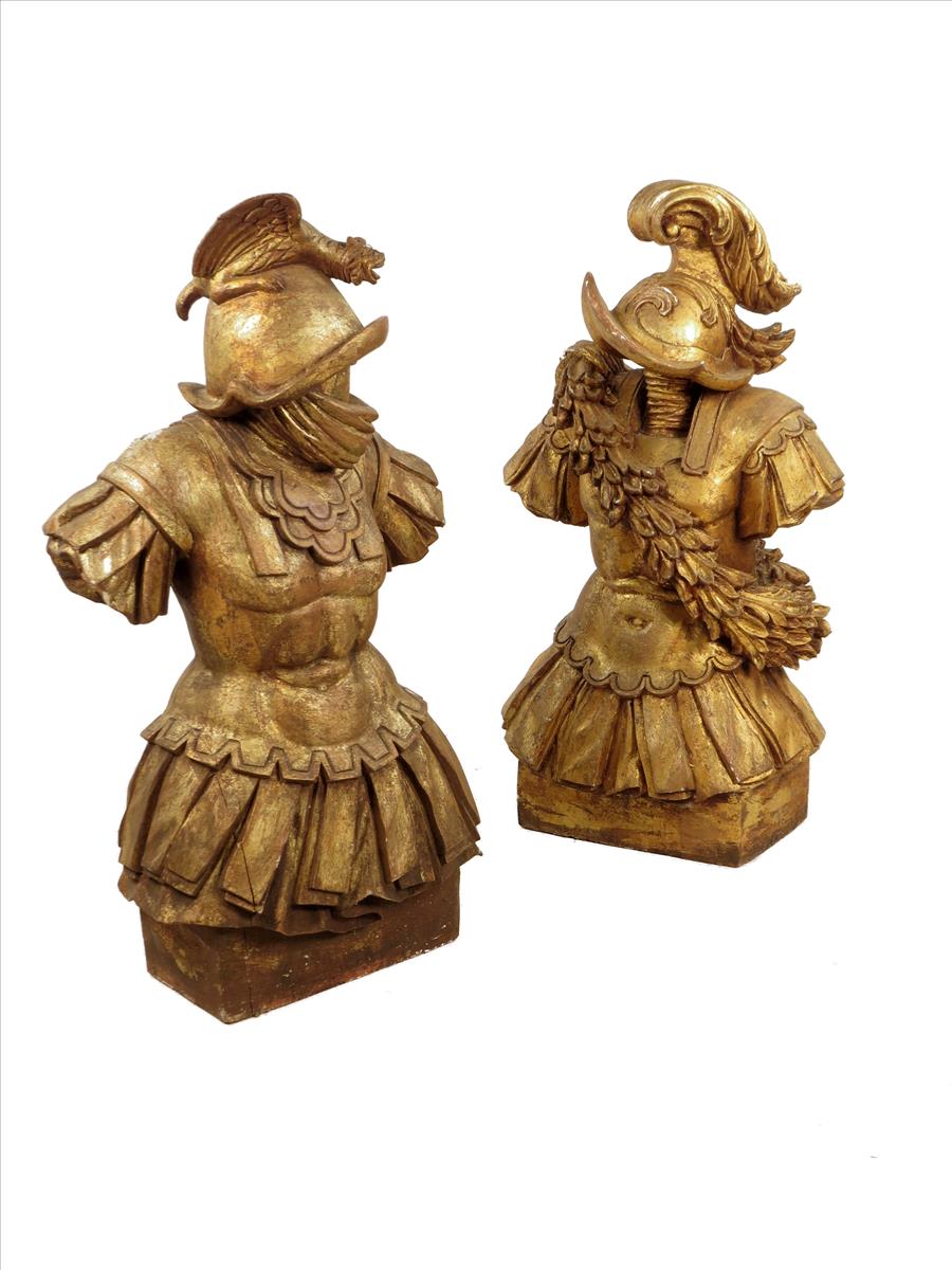 Two carved giltwood 'Roman' trophies, one with a dragon crest to the helmet the other with leaf plume and wreath, 37in (94cm) high. (2)