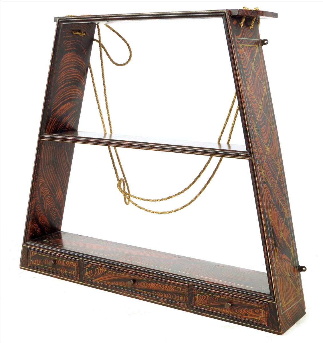 A set of early 19th century style simulated rosewood wall shelves, the base with three drawers, modern, 26in (66cm) high, 29¾in (75.5cm) wide, 5½in (13.8cm) deep.