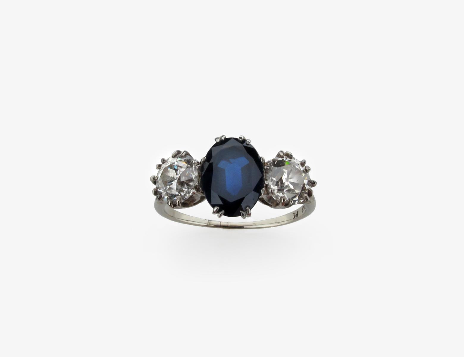 A sapphire and diamond three stone ring, the oval shaped sapphire is set with two old circular cut diamonds in platinum and gold. Size L 1/2.